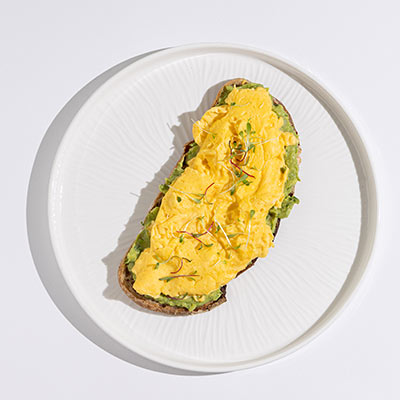 Eggs, almond milk, mashed avocado mix, black sesame, microgreens, sliced sourdough.