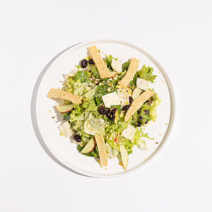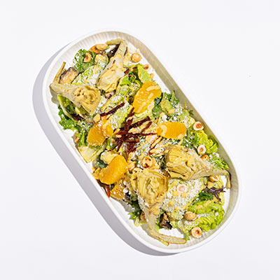 Grilled artichoke hearts, mix green & succrine, mushrooms, parmesan, olives, sundried tomato, avocado, orange segments, hazelnuts, lemon mustard dressing.