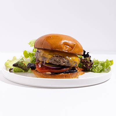 200gr of Australian beef patty, mature cheddar, PV smokey sauce, cornichons, lolo rosso, tomatoes & red onions, baked potatoes on the side; double glazed burger bun.