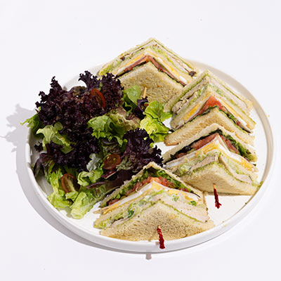 Rosemary grilled chicken, smoked turkey, Emmental Swiss, boiled eggs, house pesto, lolo rosso, tomatoes, gherkins, iceberg slaw; toasted pain de mie.