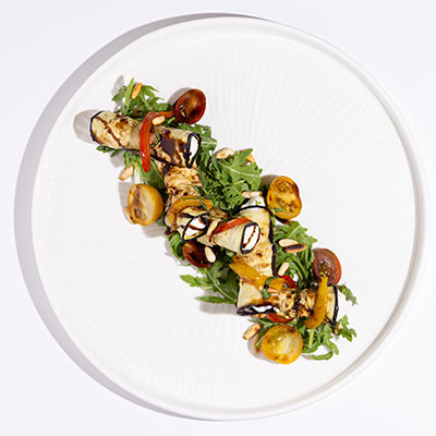 Grilled eggplant & goat cheese rolls, heirloom tomatoes, basil, piquillo bell pepper, pine nuts, arugula; balsamic glaze & E.V olive oil.