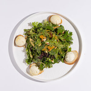 Warm goat on toast, mesclun & baby rocca, yellow peppers, green apple, sundried tomato, pine nuts; orange balsamic sauce.
