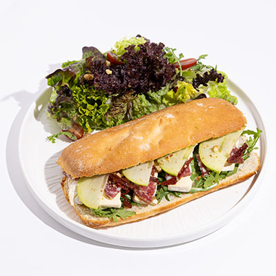 Brie cheese, rosette de Lyon salami, Granny Smith apple, sundried tomato, arugula, toasted walnuts, honey; sourdough baguette.