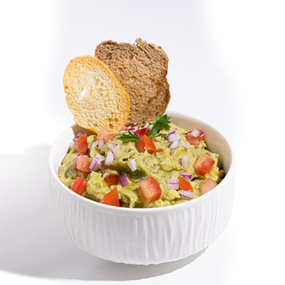 Authentic guacamole served with baked crunchy baguette.