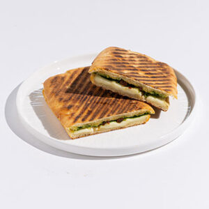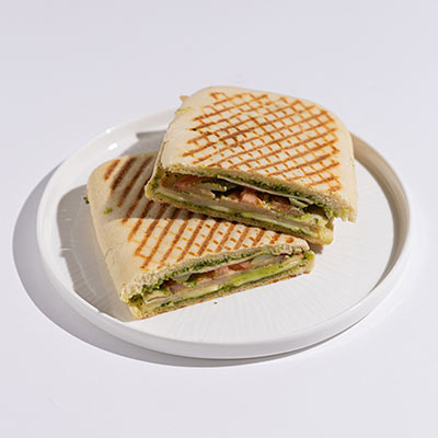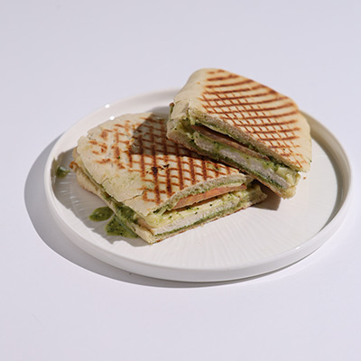 Chicken, emmental cheese, pesto & light mayo sauce, tomato, pickled cornichon; panini