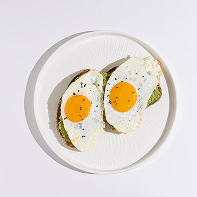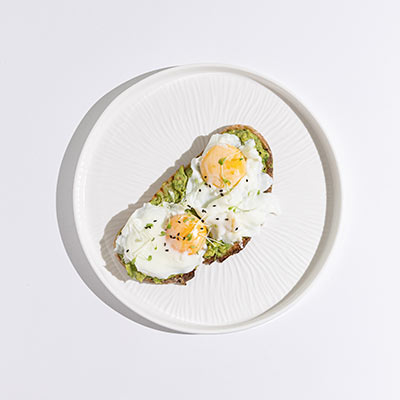 Eggs, mashed avocado mix, black sesame, microgreens, sliced sourdough.