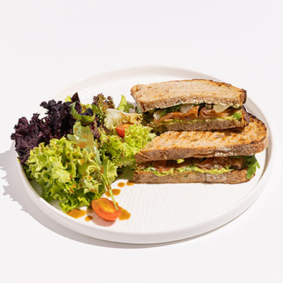 Turkey, emmental cheese, pesto & light mayo sauce, tomato, pickled cornichon, panini, side salad.