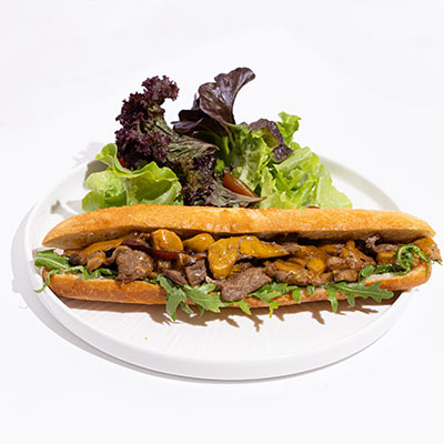 Beef strips, truffle Boursin, caramelized red onions, sauteed mushrooms, mature cheddar, arugula; white baguette.