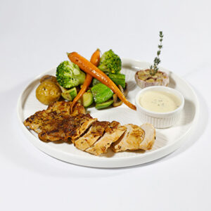 Half boneless chicken marinated in our signature red sauce, served with sautéed vegetables and Dijon sauce