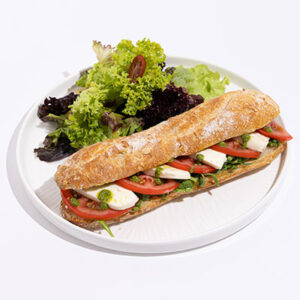Halloumi, sundried tomato, pesto sauce, rocca, panini, side salad.