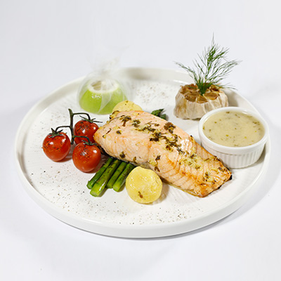 210g of Scottish salmon fillet, served with asparagus, baby potatoes, and lemon herb sauce