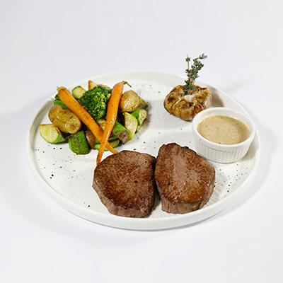 210g of Australian MB3 tenderloin, served with sautéed vegetables, and pepper sauce