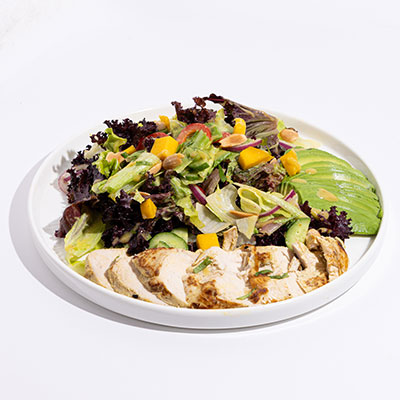 Grilled chicken, iceberg & lolo rosso mix, mango, avocado, coriander, cucumber, red onion, bell pepper, toasted almonds; thai sauce.